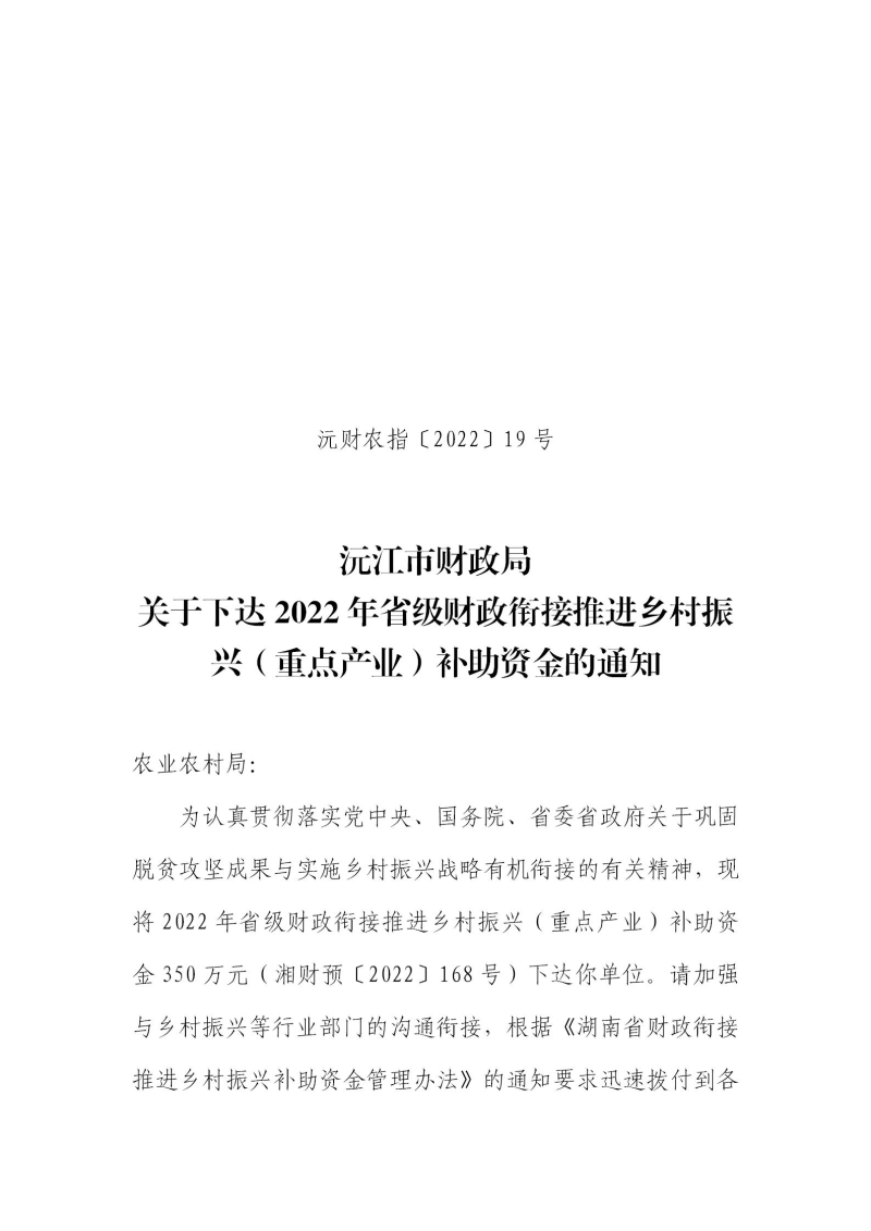 沅财农指〔2022〕19号 沅江市财政局关于下达2022年省级财政衔接推进乡村(重点产业)振兴补助资金的通知