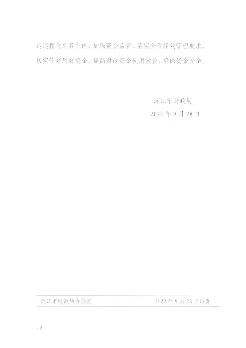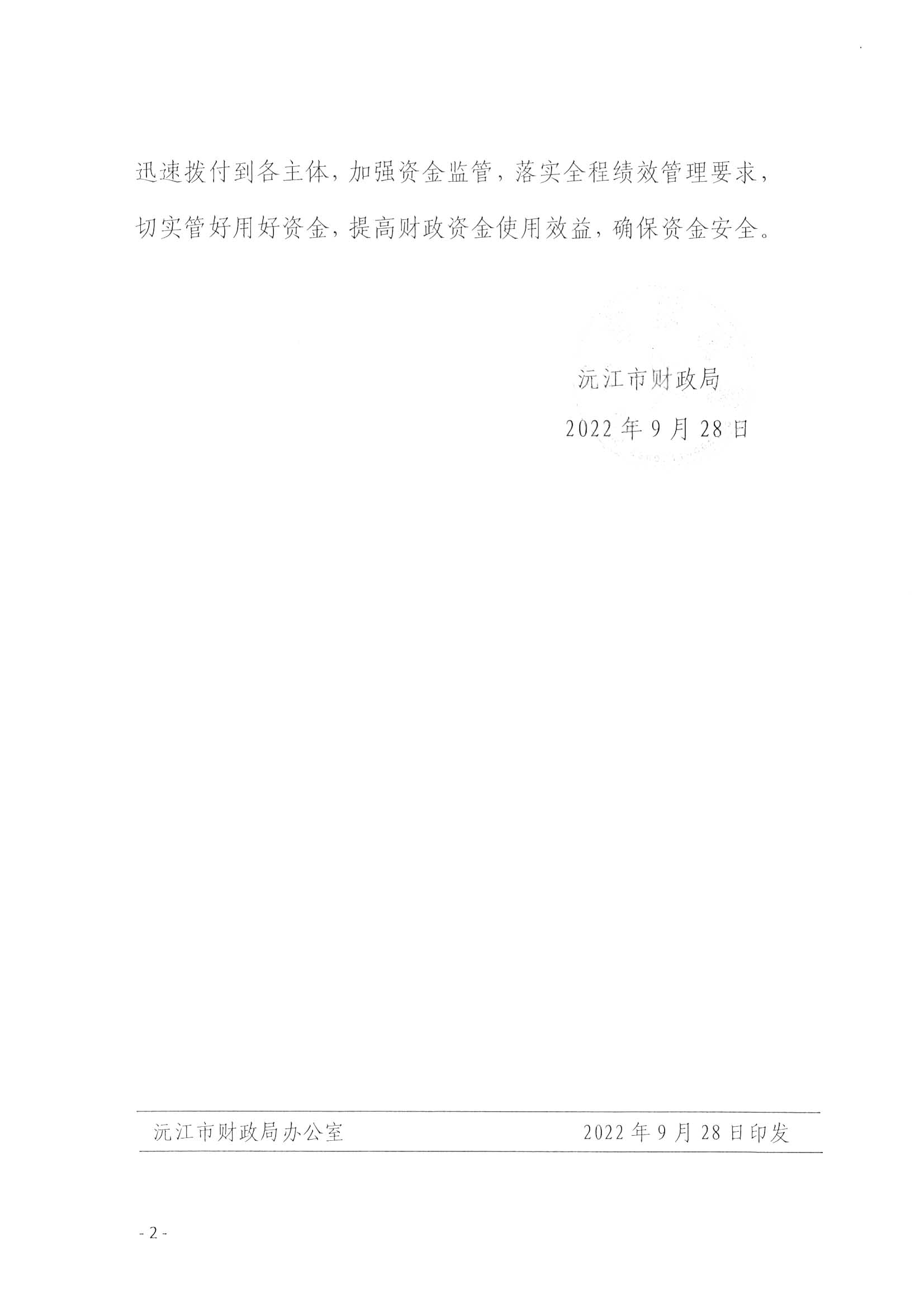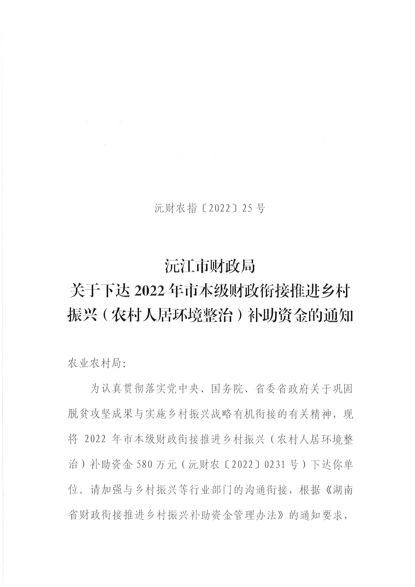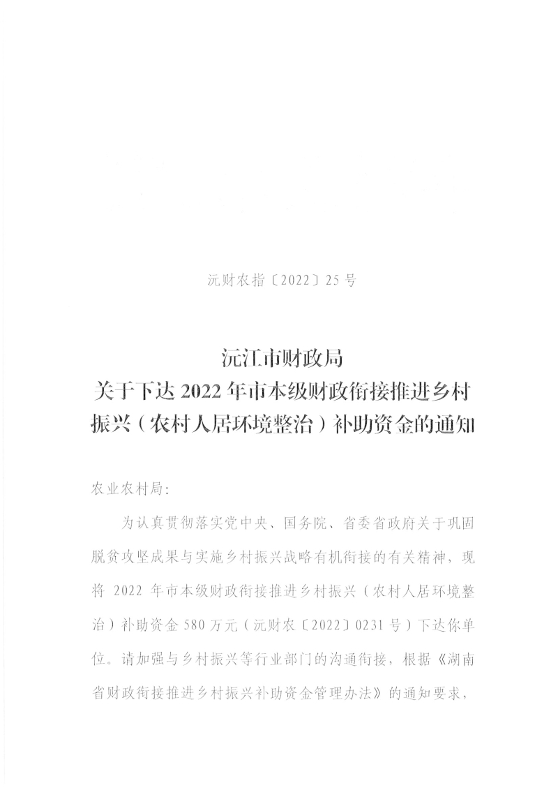 沅财农指〔2022〕25号 关于下达2022年市本级财政衔接推进乡村振兴(农村人居环境整治)补助资金的通知