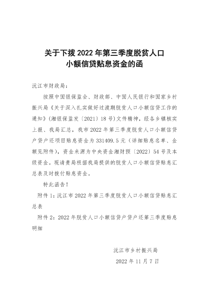 关于下拨2022年第三季度脱贫人口小额信贷贴息资金的函