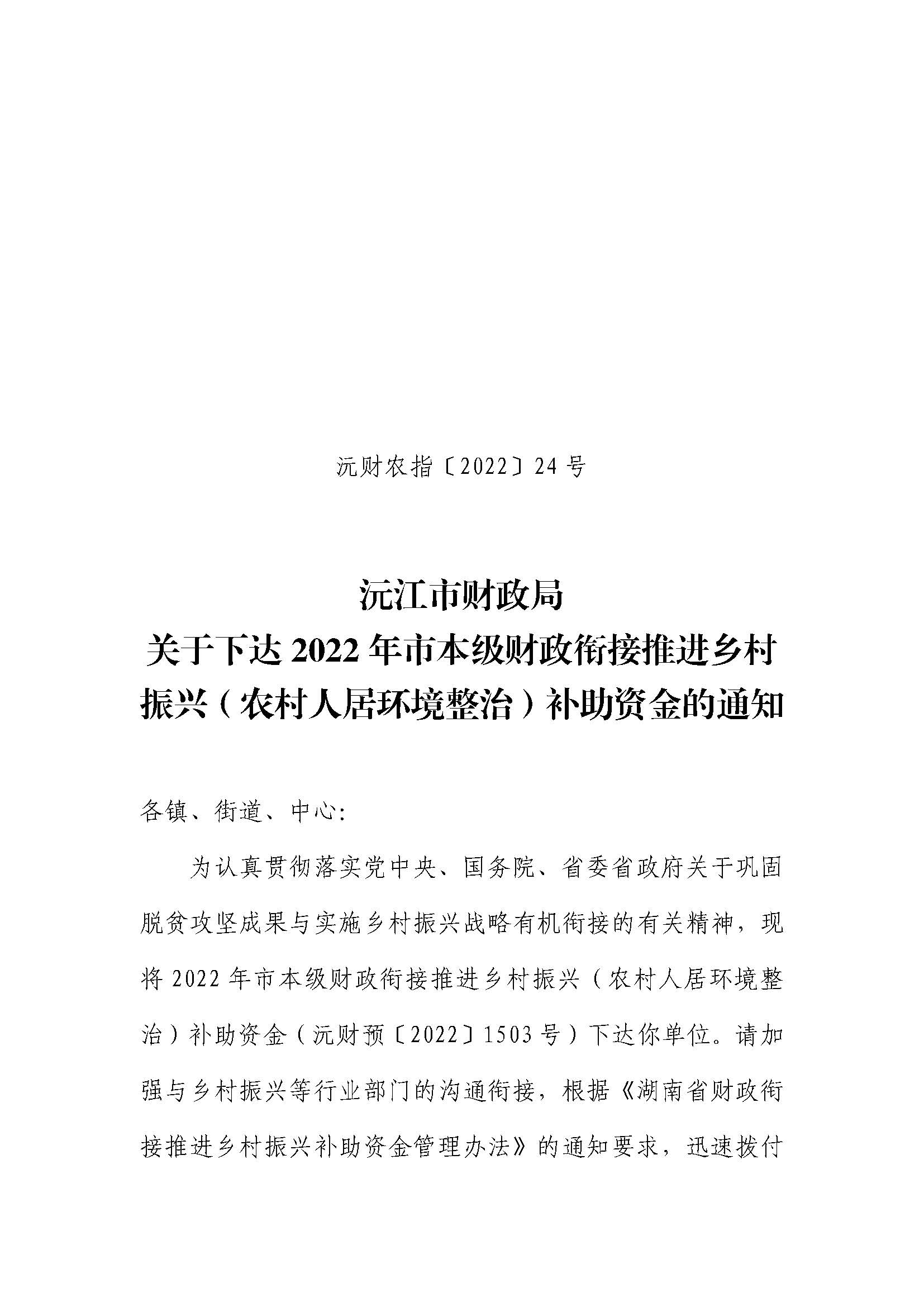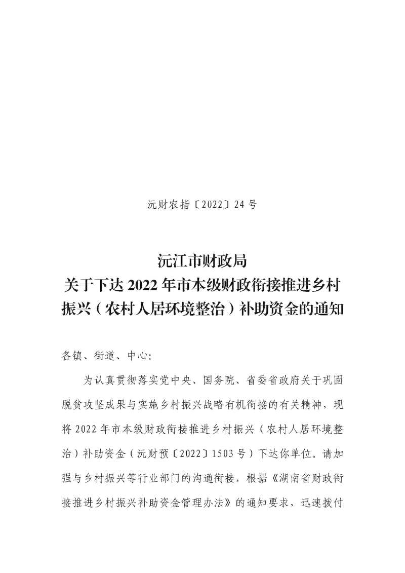 沅财农指〔2022〕24号 关于下达2022年市本级财政衔接推进乡村振兴(农村人居环境整治)补助资金的通知