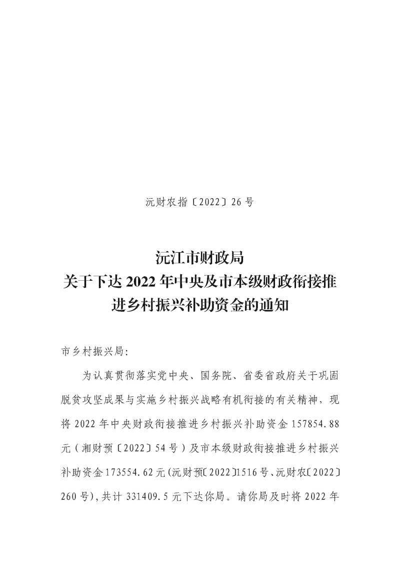 沅财农指〔2022〕26号 沅江市财政局关于下达2022年中央及市本级财政衔接推进乡村振兴补助资金的通知