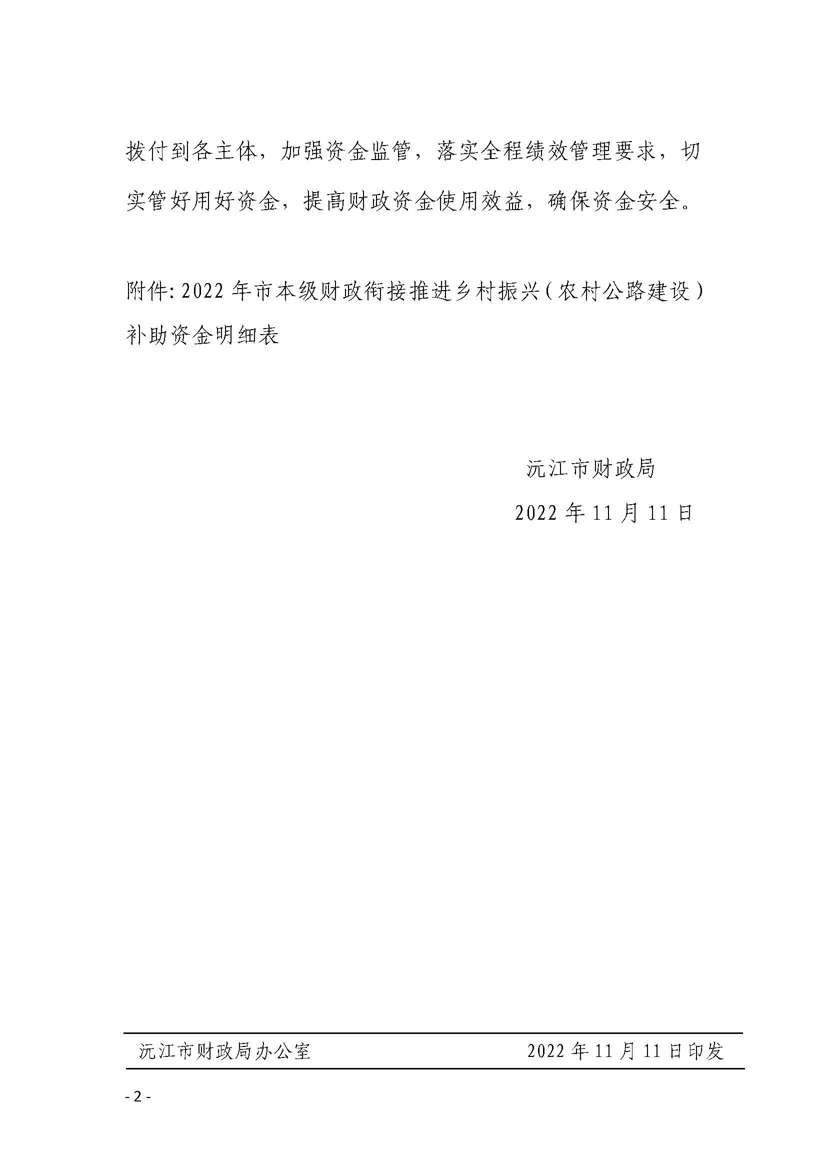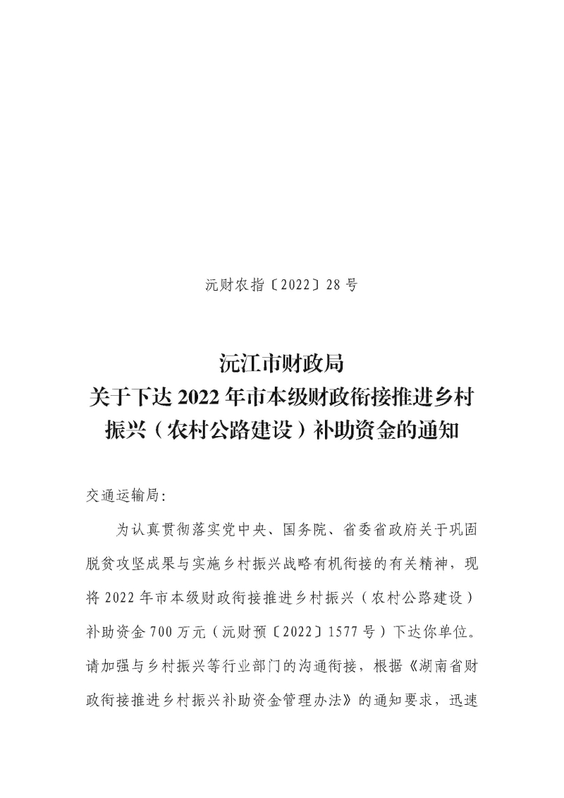 沅财农指〔2022〕28号 关于下达2022年市本级财政衔接推进乡村振兴(农村公路建设)补助资金的通知