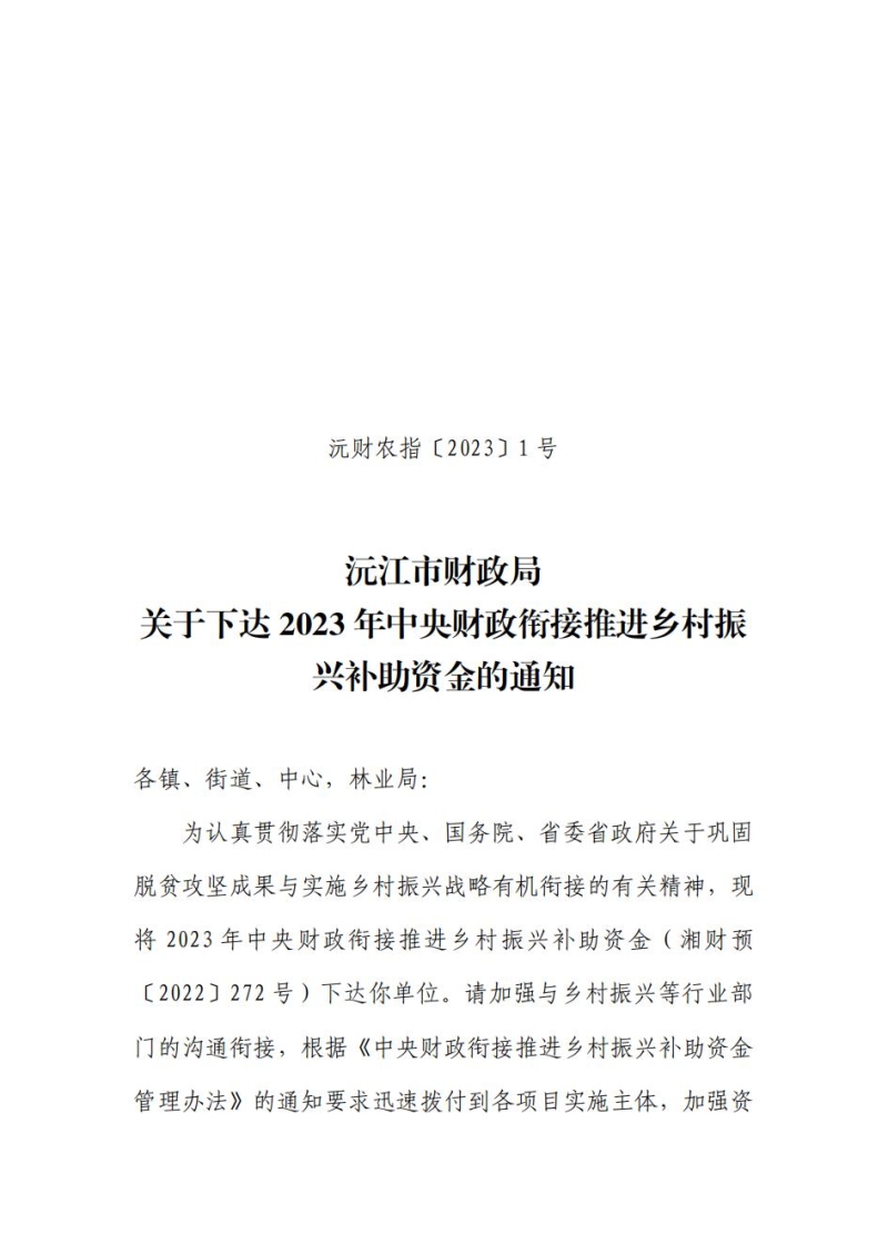 沅财农指〔2023〕1号 关于下达2023年中央财政衔接推进乡村振兴补助资金的通知