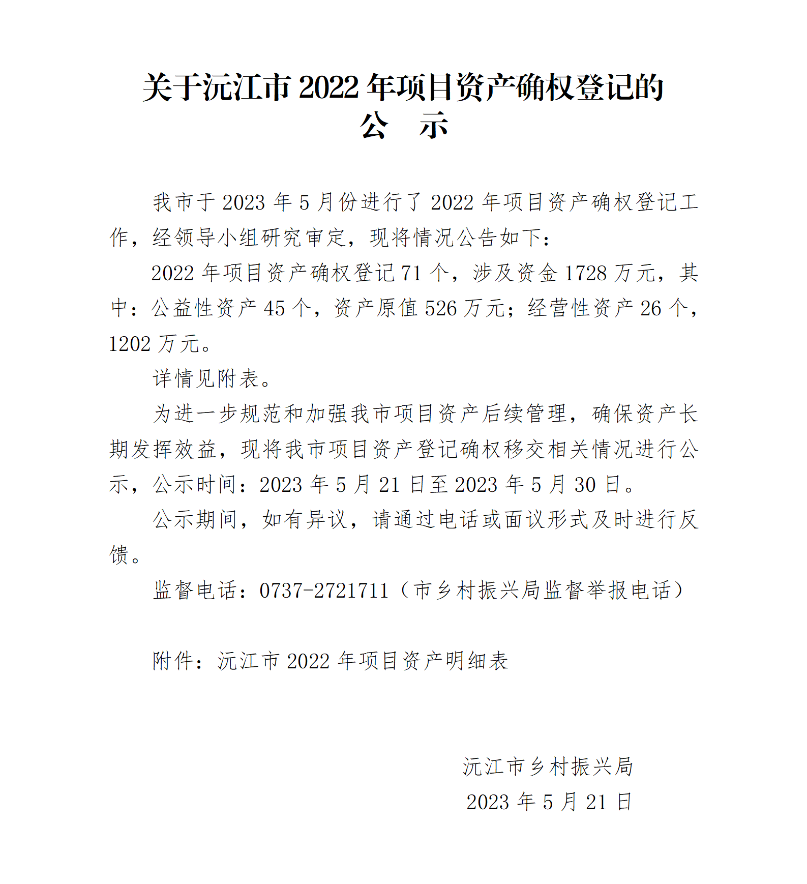 关于沅江市2022年项目资产确权登记的公示
