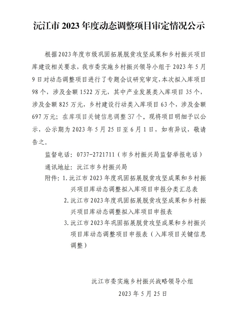 1.沅江市2023年度巩固拓展脱贫攻坚成果和乡村振兴项目库动态调整拟入库项目申报分类汇总表.xlsx 2.沅江市2023年度巩固拓展脱贫攻坚成果和乡村振兴项目库动态调整拟入库项目申报表.xlsx 3.沅江市2023年度巩固拓展脱贫攻坚成果和乡村振兴项目库动态调整项目申报表(入库项目关键信息调整).xlsx