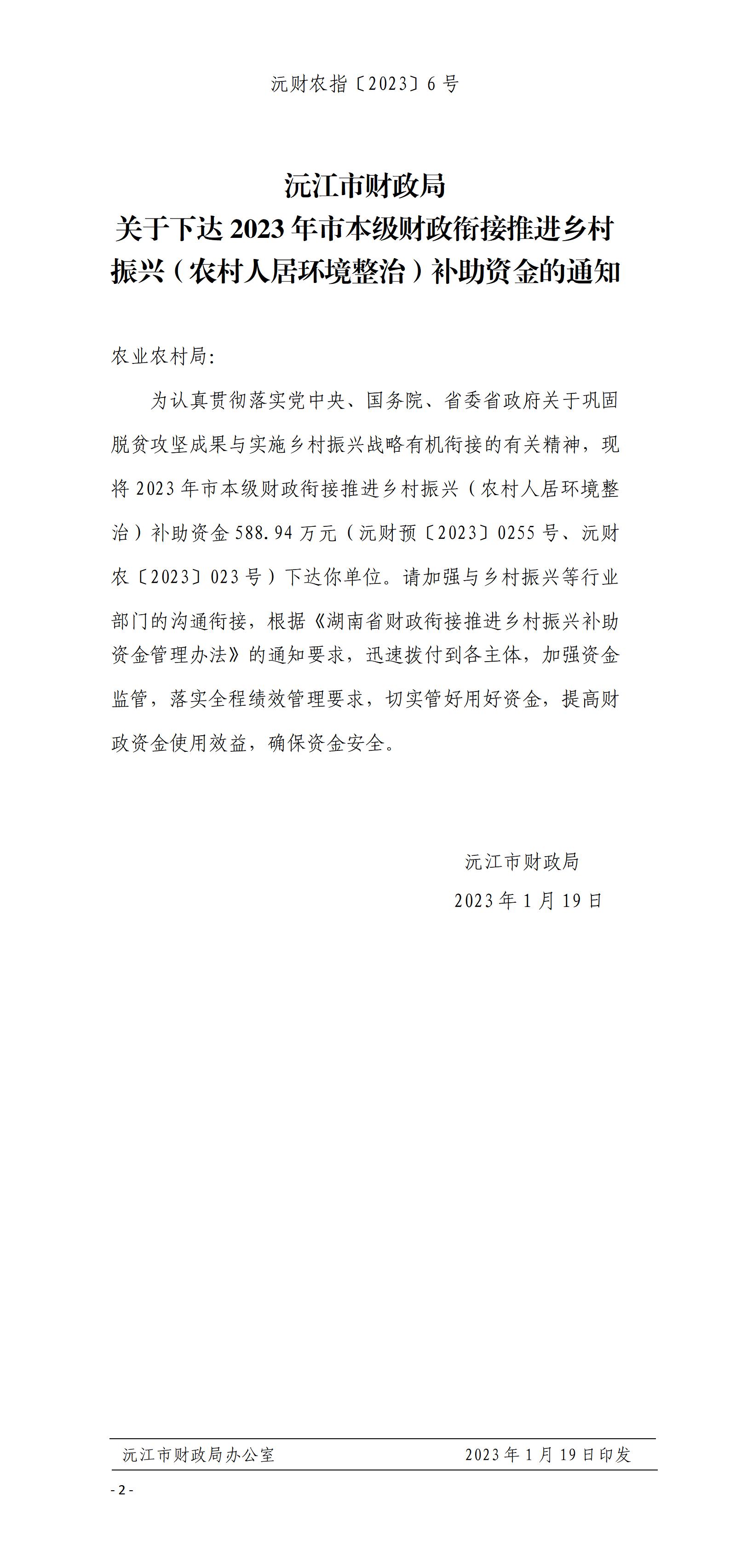 沅财农指〔2023〕6号关于下达2023年市本级财政衔接推进乡村振兴(农村人居环境整治)补助资金的通知