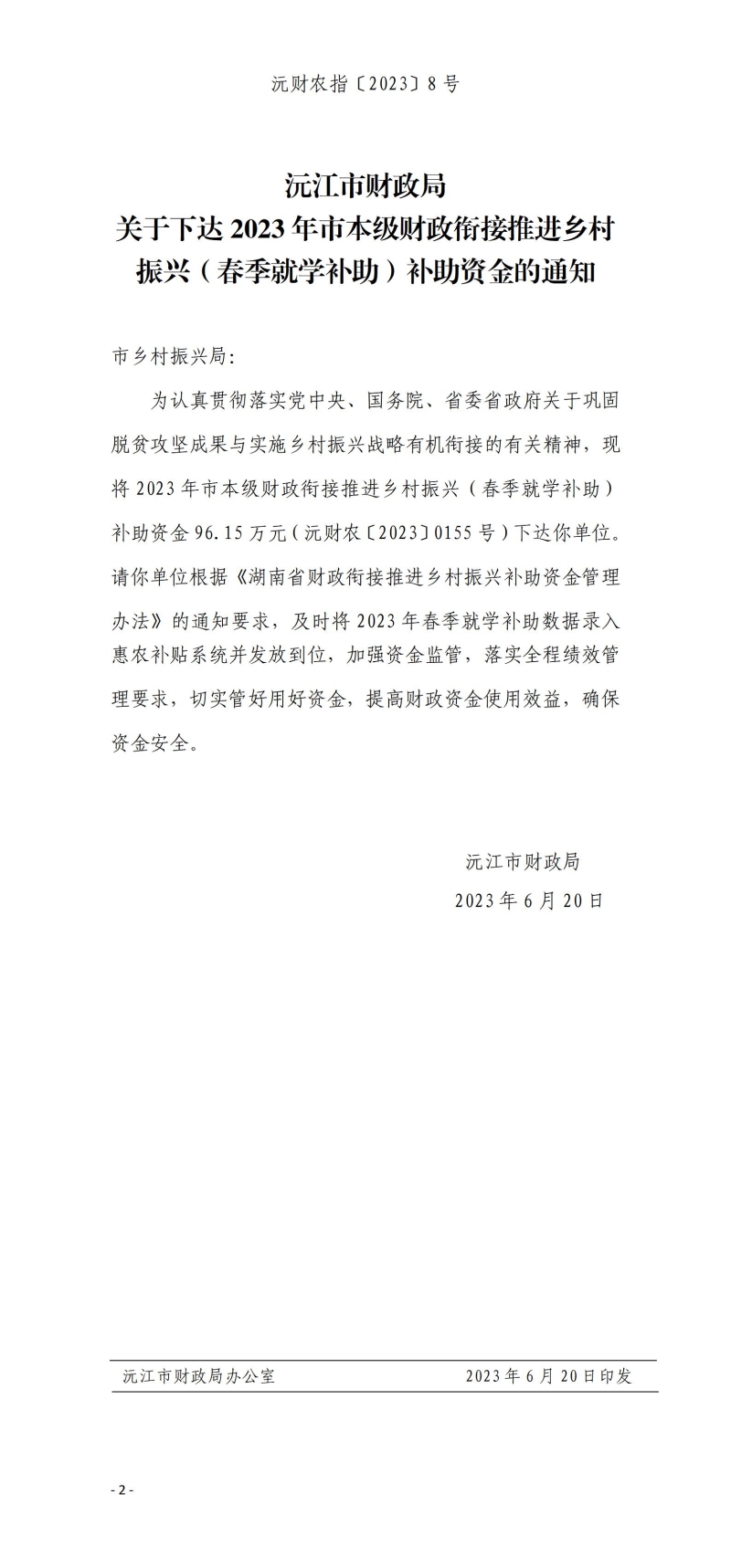 沅财农指〔2023〕8号关于下达2023年市本级财政衔接推进乡村振兴(春季就学补助)补助资金的通知