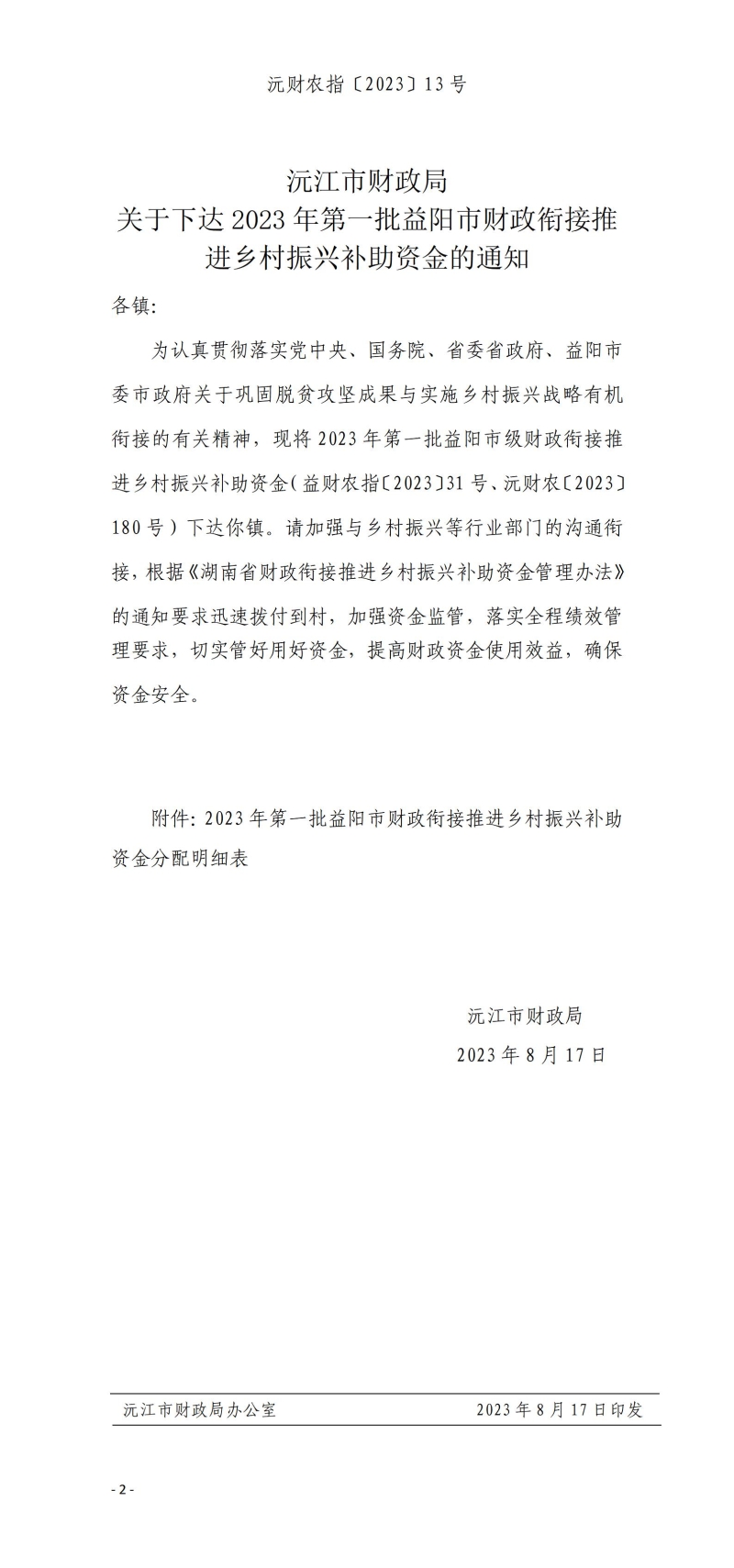 沅财农指〔2023〕13号 沅江市财政局 关于下达2023年第一批益阳市财政衔接推进乡村振兴补助资金的通知
