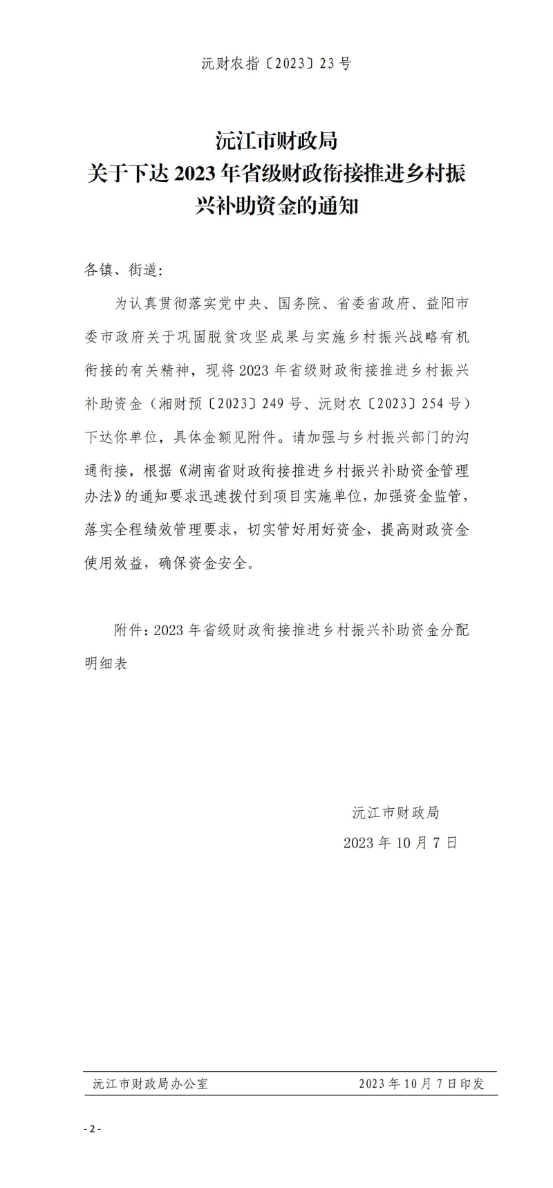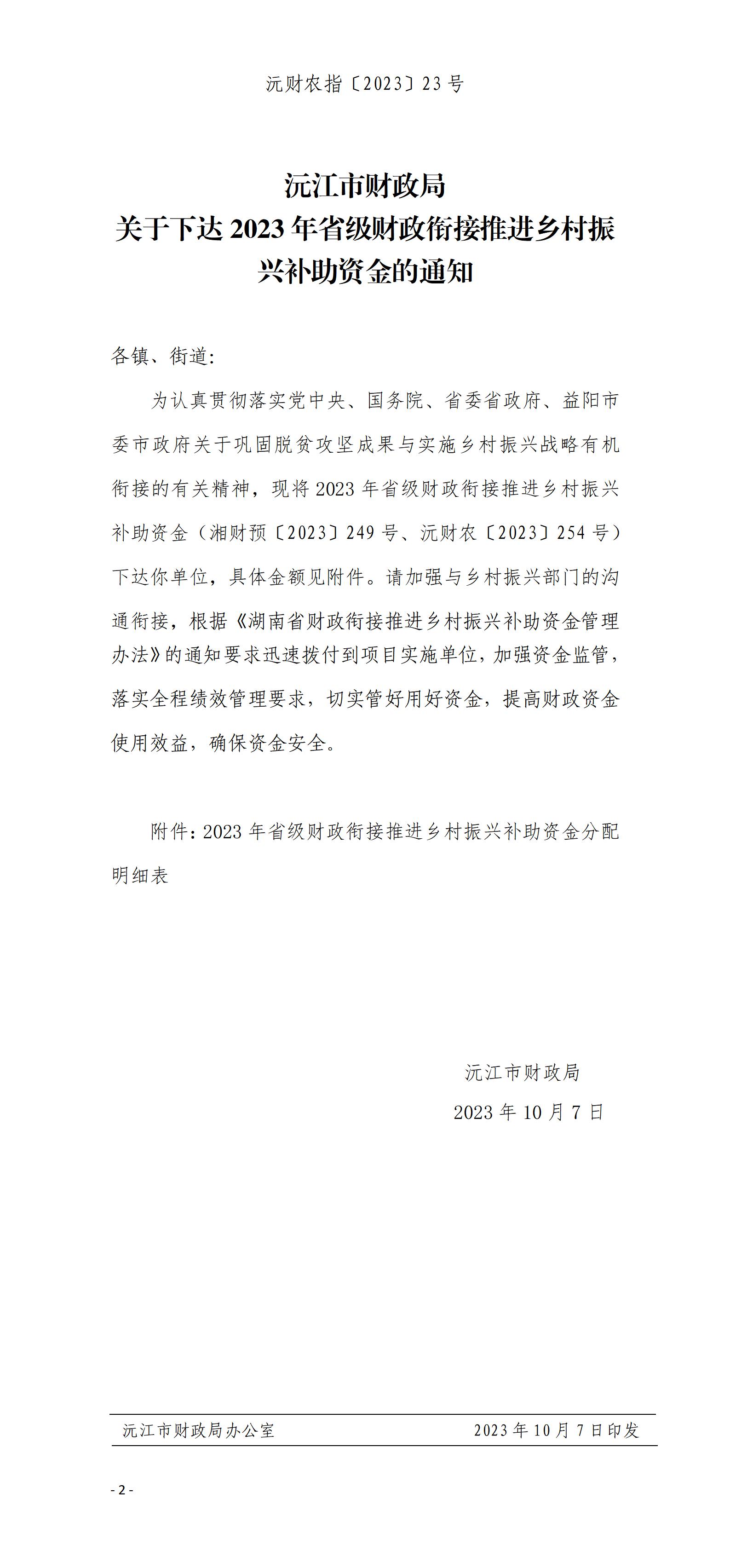 沅财农指〔2023〕23号沅江市财政局 关于下达2023年省级财政衔接推进乡村振兴补助资金的通知
