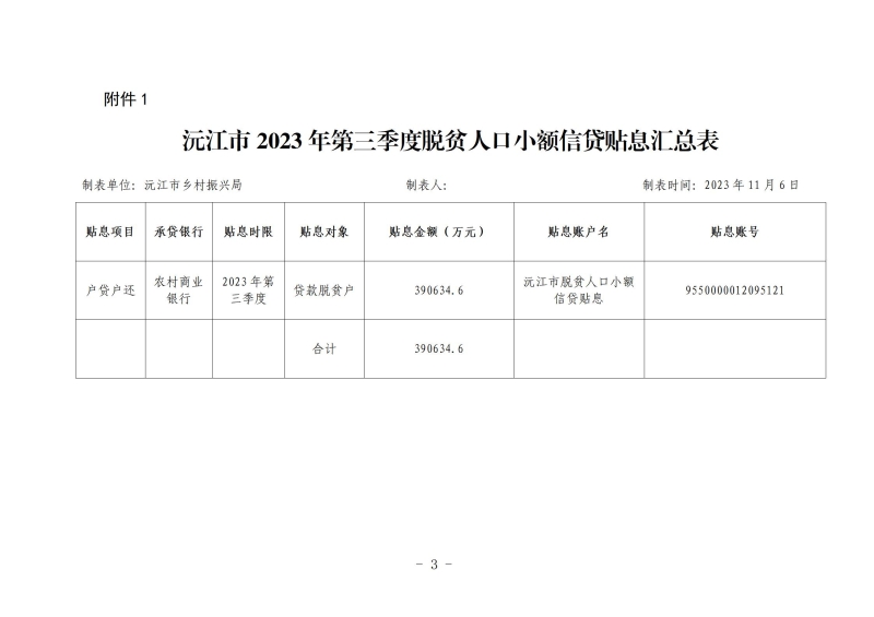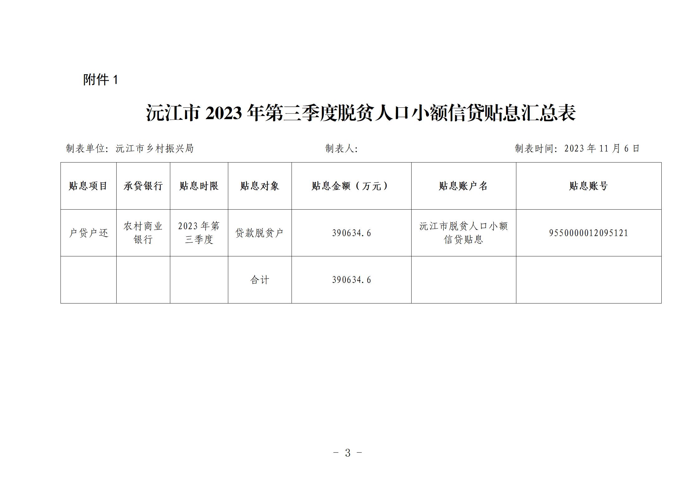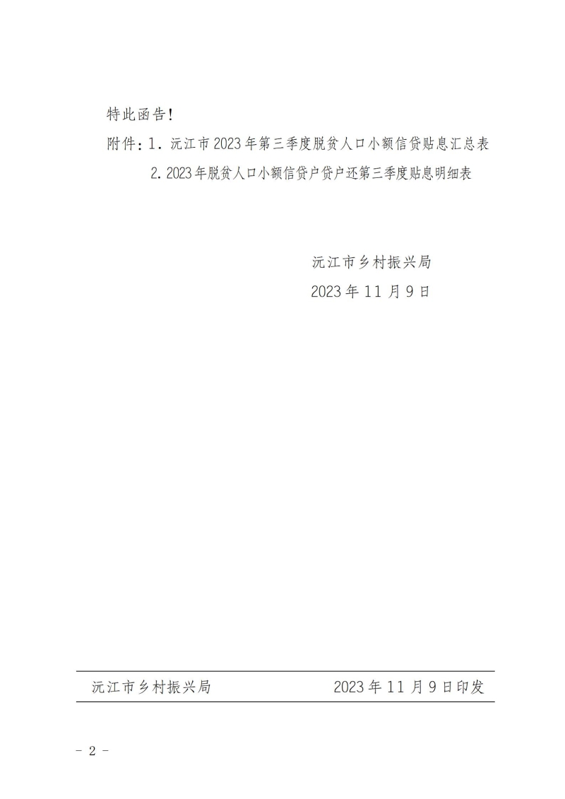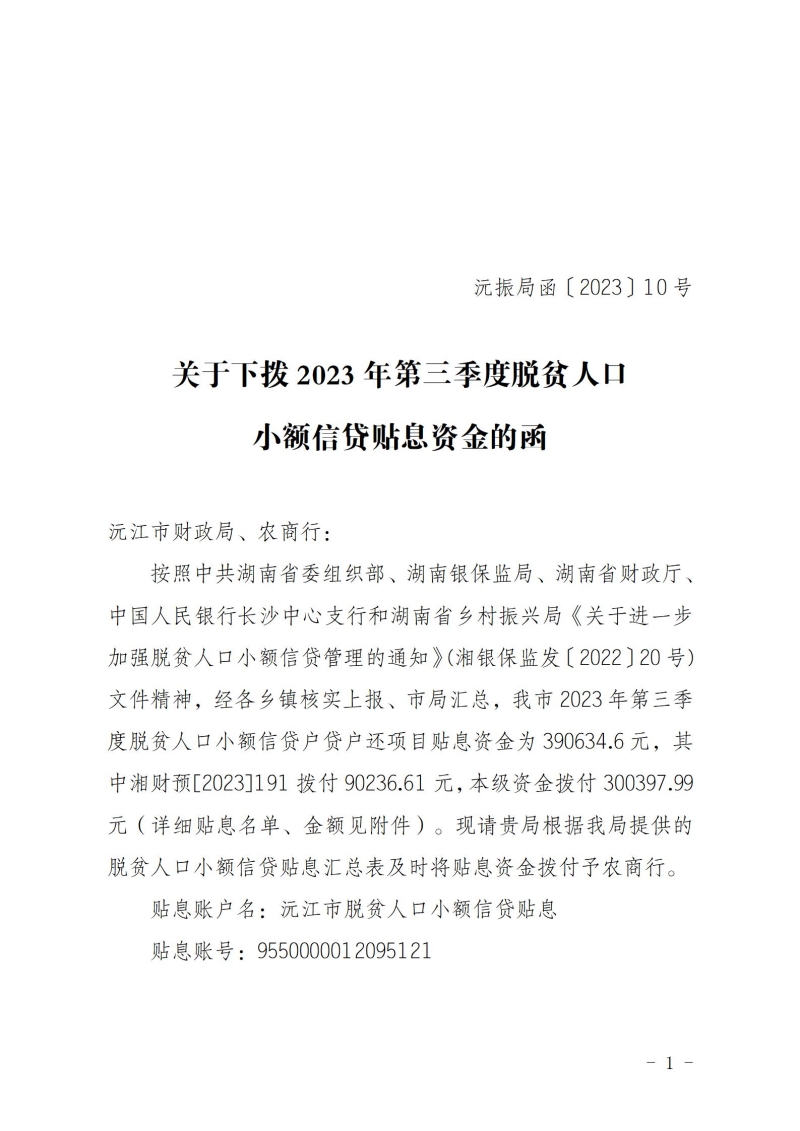 沅振局函〔2023〕10号关于下拨2023年第三季度脱贫人口小额信贷贴息资金的函