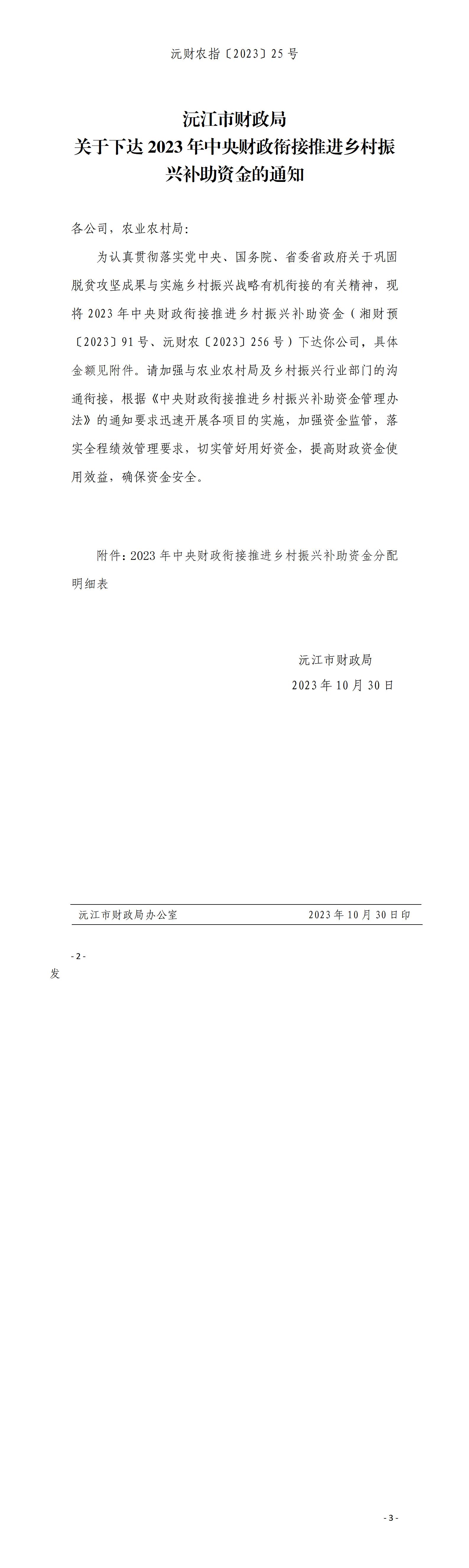 沅财农指〔2023〕25号沅江市财政局 关于下达2023年中央财政衔接推进乡村振兴补助资金的通知