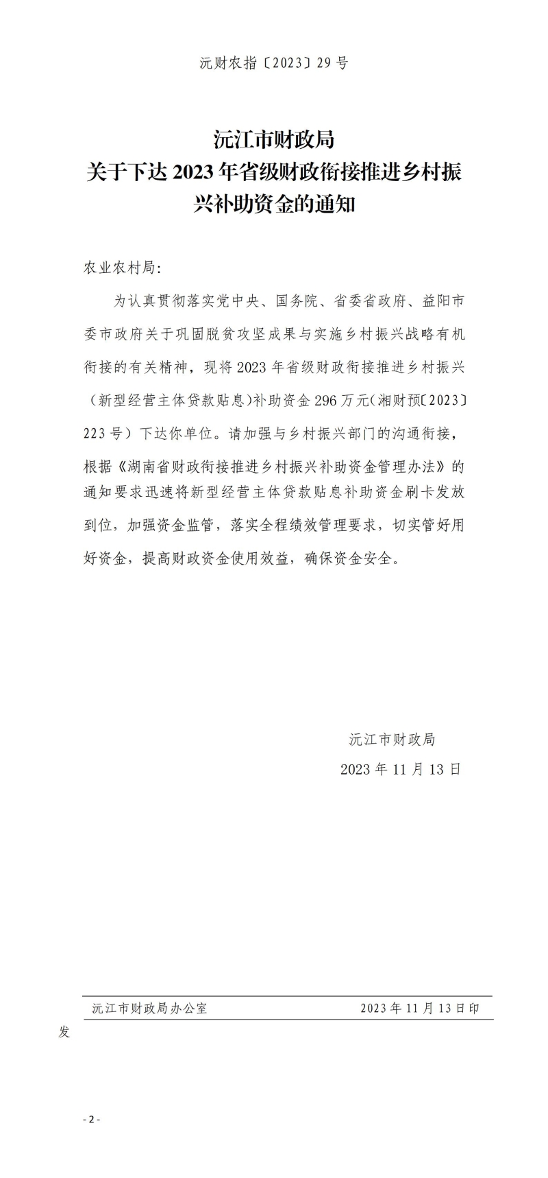 沅财农指〔2023〕29号沅江市财政局 关于下达2023年省级财政衔接推进乡村振兴补助资金的通知