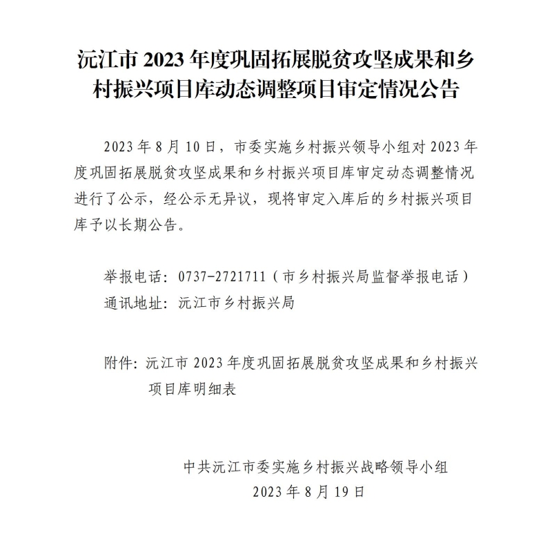 沅江市2023年度巩固拓展脱贫攻坚成果和乡村振兴项目库动态调整项目审定情况公告