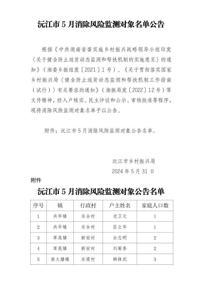沅江市5月消除风险监测对象名单公告(第二批)