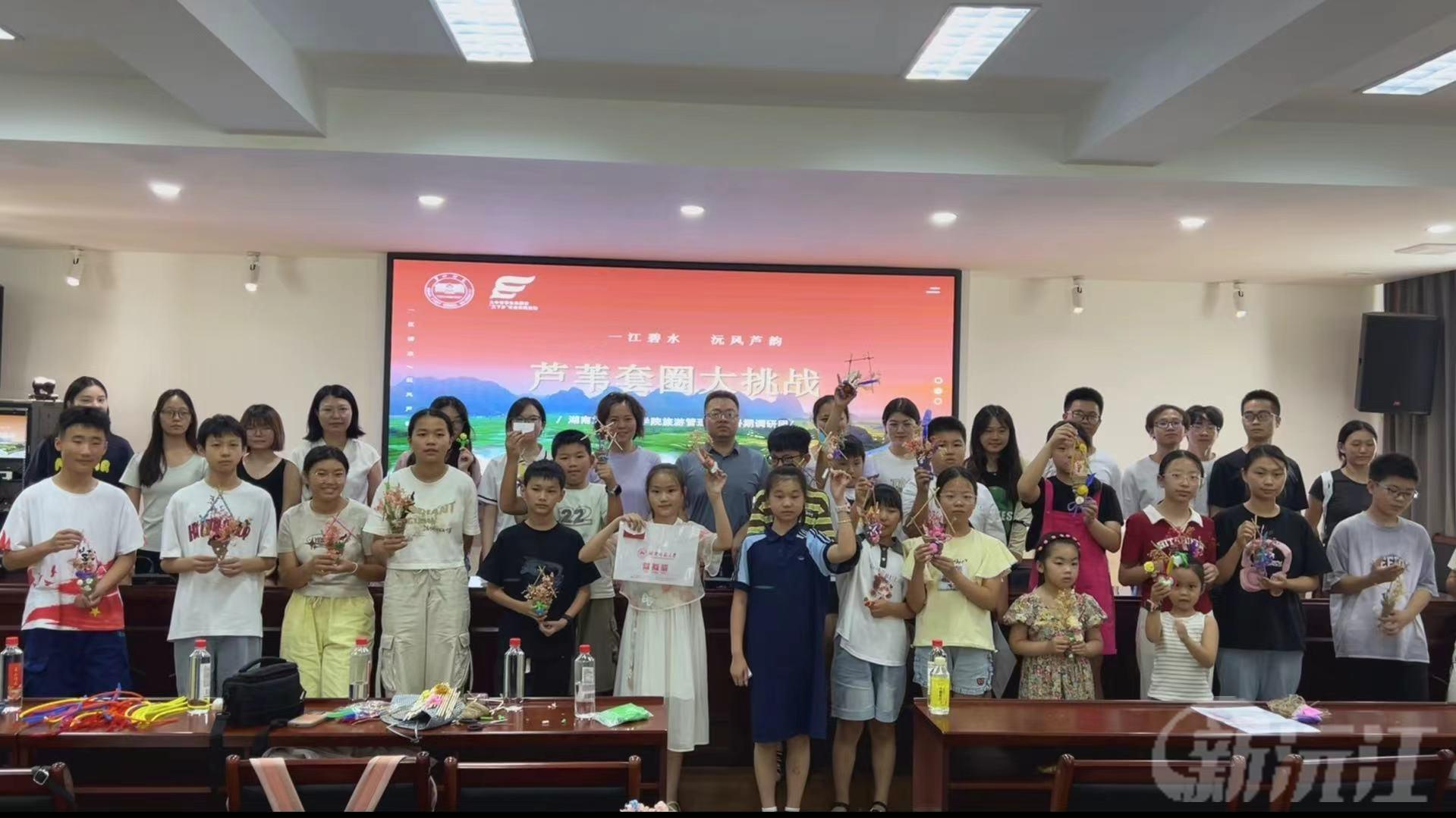 在手工课上,同学们利用芦苇、麻绳、木棍等材料,在志愿者指导下制作“环保花篮”“环保挂饰”等创意作品,同时开展芦苇套圈大挑战等游戏。现场气氛活跃、学生们热情高涨。通过将自然材料与艺术创作结合,传递了“变废为宝”的环保理念,强化了学生对湿地生态系统价值的认知。