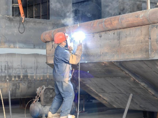 湖南万骏船舶有限公司的工人正在焊接船体。