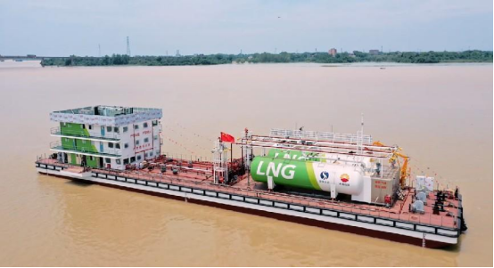 产自沅江船舶制造产业园的湖南省首艘200立方LNG新能源油气加注船。