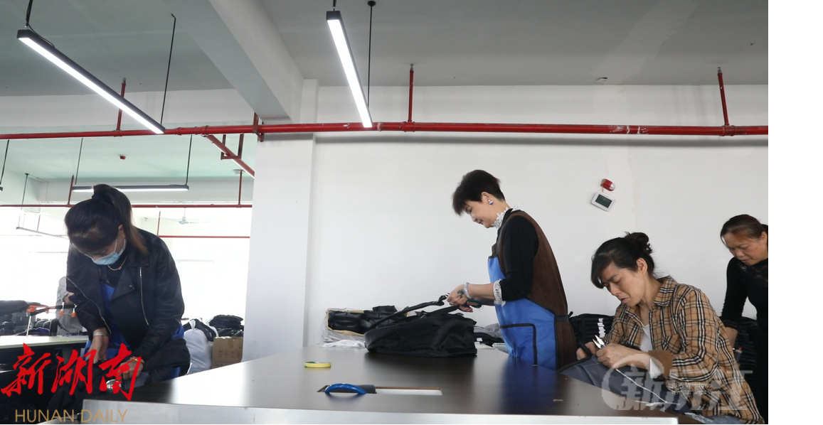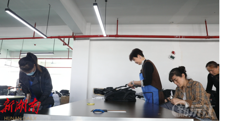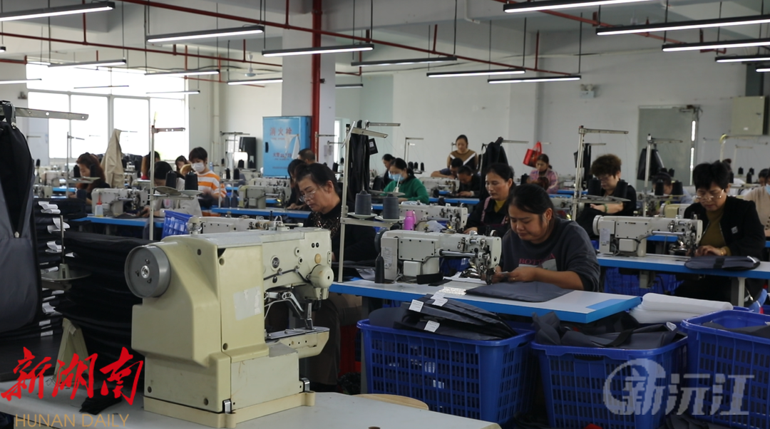 走进沅江长盈皮具有限公司标准化厂房,几十台缝纫机嗒嗒作响。在工人们熟练地操作下,针尖飞速穿插,压线、包边、缝合等,每一项流程都有条不紊地进行着,工人们各司其职,高效配合,赶订单、忙生产,车间内一派火热景象。