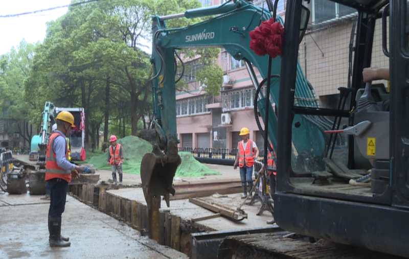 在施工现场,工人们正在安装工字钢支护,防止两侧边坡垮塌。同时对入户管进行安装,以便精准收集住户排污管的污水。