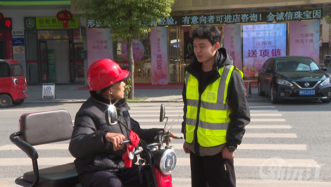 在草尾镇草尾大道与兴新路的交汇处,两名身着鲜亮反光背心的工作人员身姿挺拔,专注地注视着过往的行人和车辆。他们眼神敏锐,时刻留意着每一个可能出现的不文明交通行为。一辆电动车快速驶来,骑车人未佩戴头盔,在人群中显得格外扎眼,工作人员迅速做出反应,向骑车人耐心地进行劝导,指出未佩戴头盔的问题。