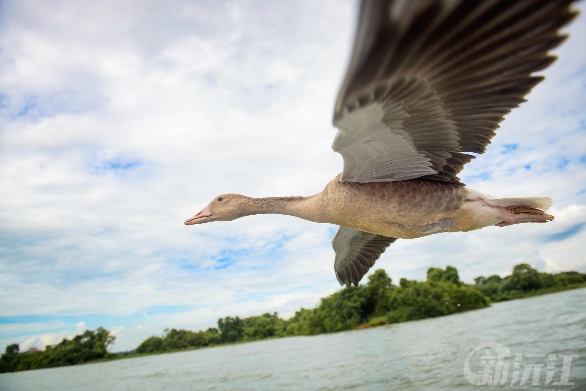 碧波荡漾的小黄家湖上,晨飞的大雁群正展现出自然的灵性,二十余只鸿雁振翅掠过水面,成群结队地绕着船舷盘旋飞舞,灰褐色的羽翼在阳光下泛着金属光泽,时而俯冲贴近水面划出涟漪,时而振翅高飞形成环形队列,仿佛在为访客上演一场自然馈赠的空中芭蕾,雁鸣声清脆悠远,在湖面久久回荡。